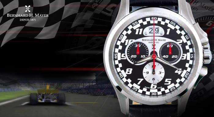 Powerful design dynamics, intuitive of Bernhard H. Mayer® timepieces combined with the accelerative attitude of motorsports comprise the Chrono Compressor watch. Precision chronograph capabilities have been captured within this masterpiece of timekeeping. The watch lends itself to the active sportsman while remaining stylish enough to be sported on the wrist of any self-respecting social high-flyer. The dominating black dial is peppered with white, making it reminiscent of the iconic chequered race flag and allowing for the large, luminous hands to be complemented by the prevailing date digits.